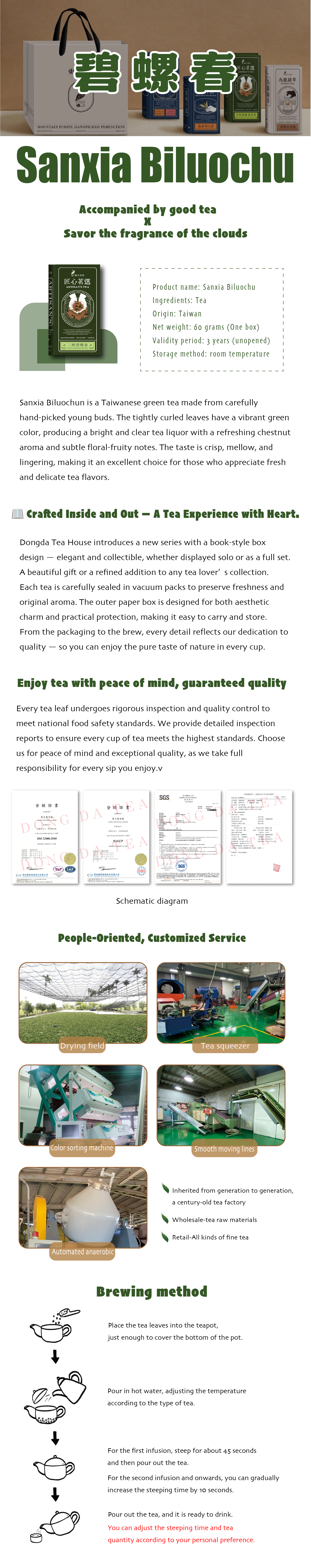 Biluochun tea is known for its tender green appearance, refreshing herbal aroma and unique twisted leaf shape.