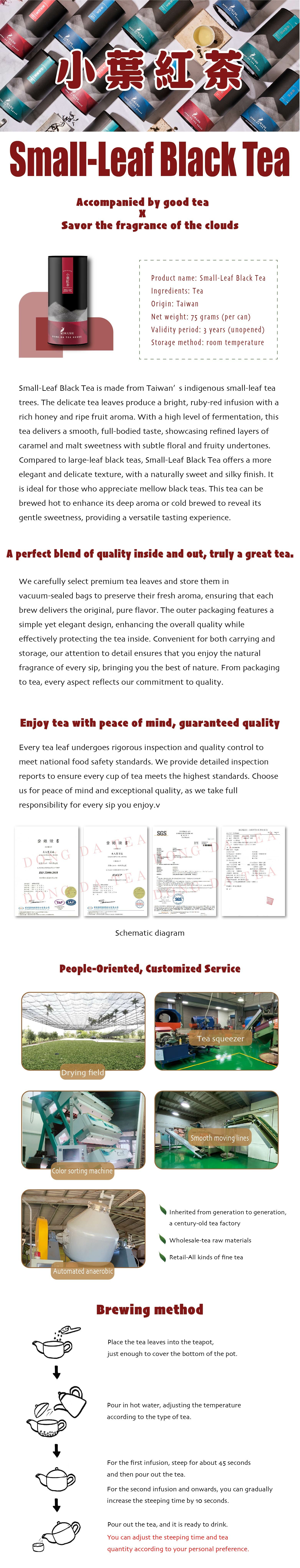 Small Leaf Black Tea is a type of black tea made from the leaves of small leaf tea trees, primarily produced in the high mountain regions of Taiwan. The characteristics of small leaf tea trees include smaller leaves, finer shoots, and tender tea leaves.