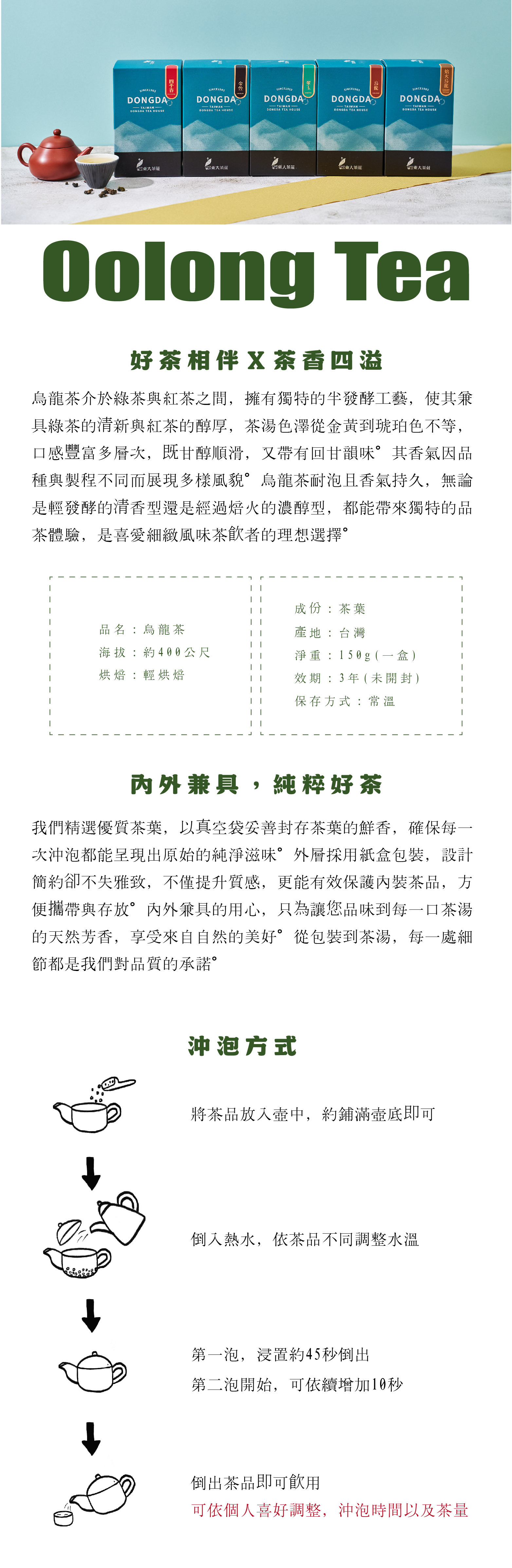 烏龍茶是介於綠茶與紅茶之間的半發酵茶,結合了綠茶的清香與紅茶的醇厚。東大茶莊精選台灣高山優質茶葉製作,茶湯金黃透亮,入口甘潤滑順,餘韻悠長。適合日常品茗,也是饋贈親友的上選。每一道製程皆經匠人手工把關,讓茶香層層展現,清新而不失厚實。