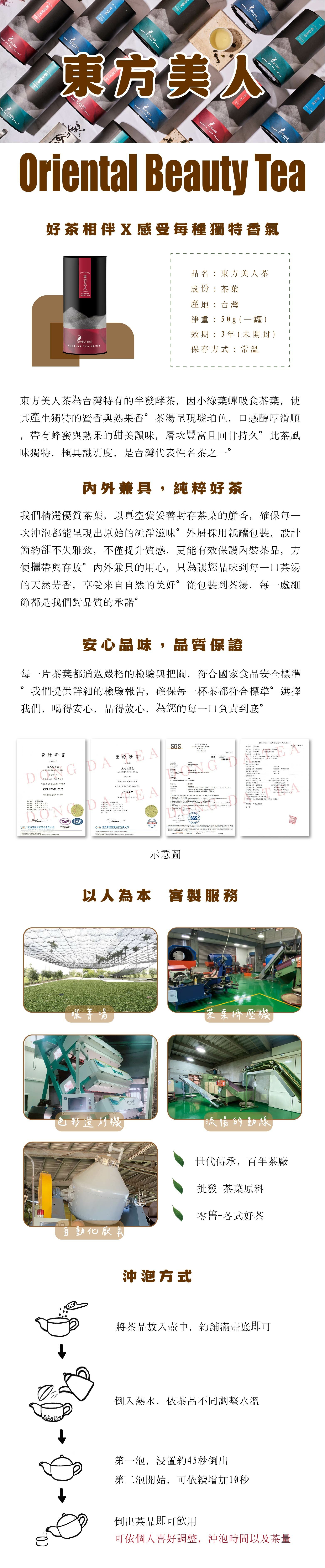 東方美人茶為台灣特有的半發酵紅茶,因小綠葉蟬吸食茶葉,使其產生獨特的蜜香與熟果香。茶湯呈現琥珀紅色,口感醇厚滑順,帶有蜂蜜與熟果的甜美韻味,層次豐富且回甘持久。此茶風味獨特,極具識別度,是台灣代表性名茶之一。
